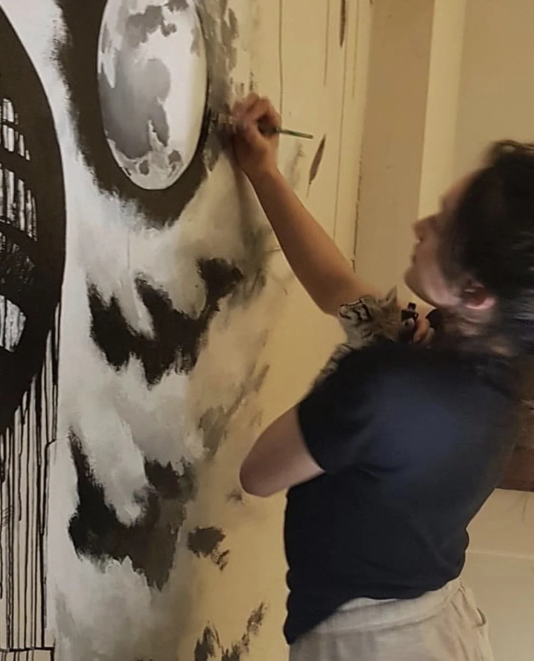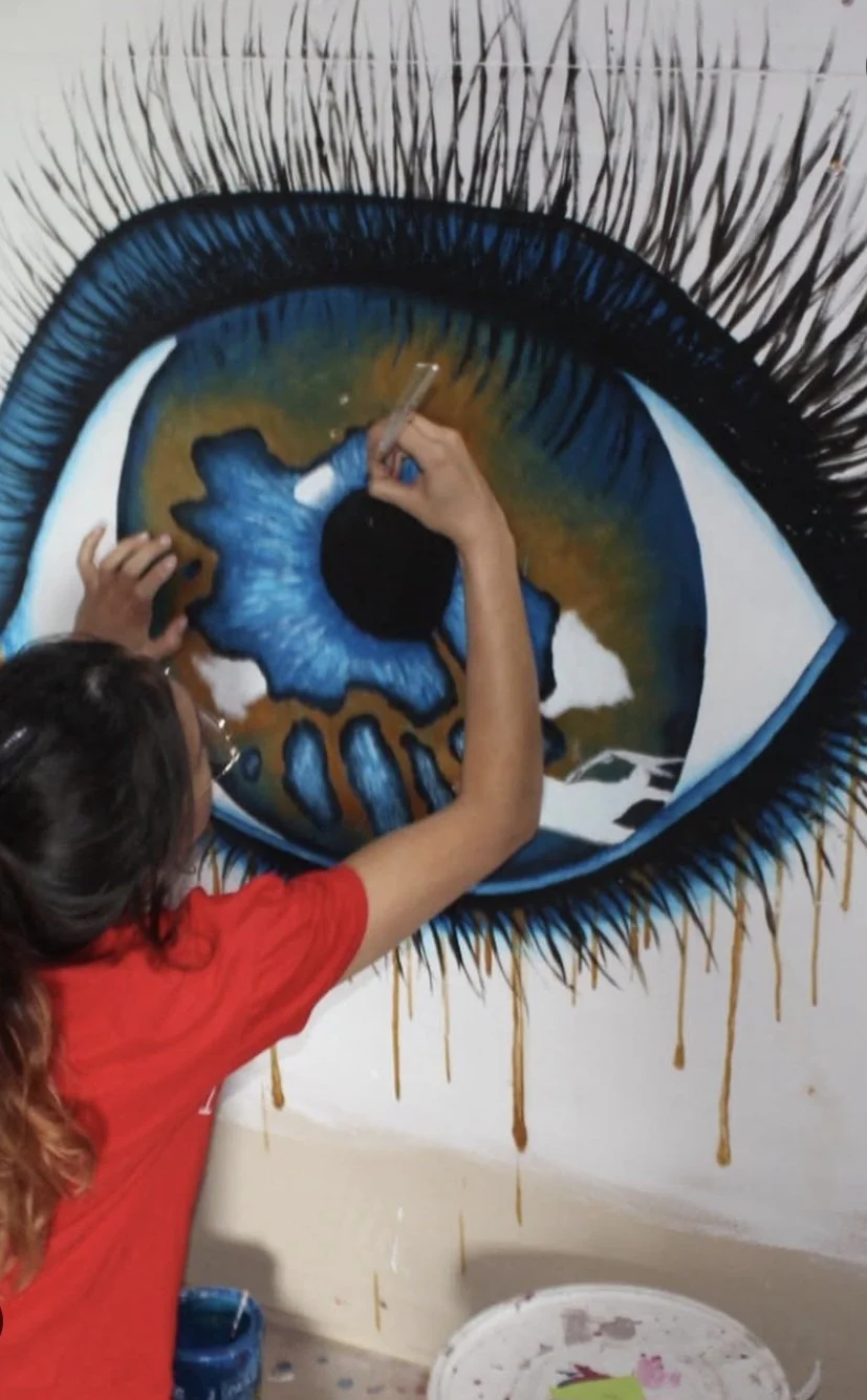 Her work lives at the intersection of chaos and beauty — vivid acrylics, spontaneous spray strokes, and delicate pen sketches that reveal both vulnerability and strength.